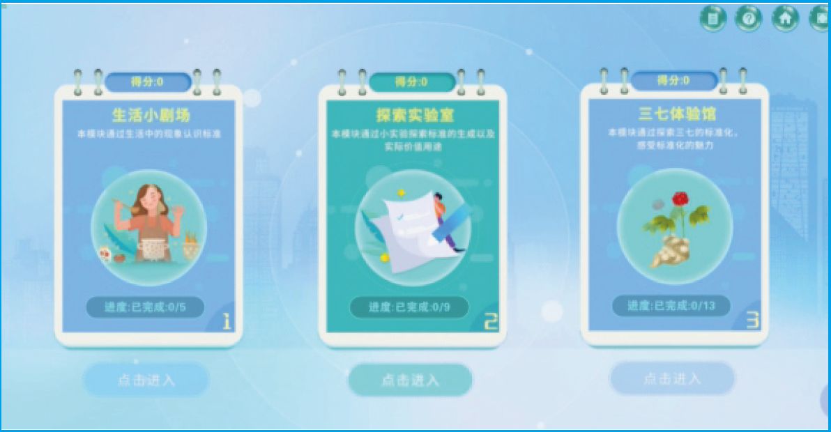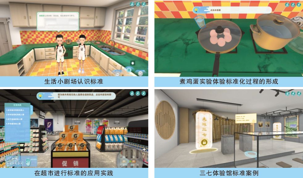 本实验坚持“虚实结合、相互补充、能实不虚”的原则,着力解决学生由于场地、经费以及时间等因素的限制,无法真正连续参与标准制定大型综合实践训练过程的难题。本实验项目设计生活小剧场模块、探索实验室模块、三七体验馆三个模块,使学生不仅了解标准、标准化、标准分类,更能让学生以沉浸式、交互式的方式学习标准相关知识及其应用实践。借助虚拟仿真技术,不仅能够模拟真实的空间场景、营造逼真氛围,做到人人参与、人人接受实践训练;还突破时间和空间的限制,让学习者可自由安排时间、地点进行练习。