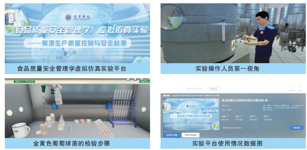 为解决传统食品质量安全管理和检验检测实验教学中的主要问题,课程团队以果酒生产企业为对象,以教育部新工科建设和教育部工程认证的指导思想为指引,围绕食品质量与安全管理、生产安全管理和质量管理中涉及的检验检测技术与控制方法,于2022年研发创建了“食品质量安全管理学虚拟仿真——果酒生产质量控制与安全检测”平台(链接网站https://ybu.zhihuishu.com/schoolPlatform.html#/virtualExperiment?courseId=2001000117&schoolId=1949&VNK=a4f7b0b5),立项为省级虚拟仿真实验教学项目,2022年立项为四川省一流本科课程。本实验内容主要包括食品质量与安全检测、安全管理和质量管理等三个方面的实训内容,涵盖果酒生产工艺全过程,模拟真实酒厂生产场景,现有知识点11个,并在实验各阶段嵌入相关知识点测试及最终考核。